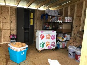 Thanks to the generous contributions of our supporters, we were able to provide the materials for a beautiful, weather-proof new shed at WMAS. Local volunteers built the shed and pulled it together, and our Last Hope volunteers spent today moving and organizing shelves, cabinets, and pantry space from the overcrowded garage currently used to house dog food and supplies.