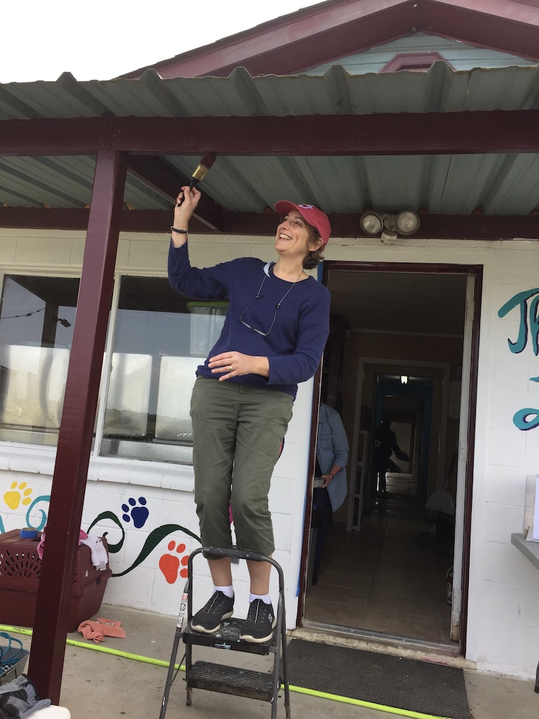 Today’s group built a run outside for the dogs, painted the puppy room and some kennels, drilled a drain in the floor (a very thick concrete floor), and finished up lots of other tasks from the day before, such as fence installation. The Animal Control Officer went home to get her tractor to aid in the fence installation, making that back breaking work a whole lot easier! And of course – we held dogs (the best job around!) while other volunteers worked in their kennels.