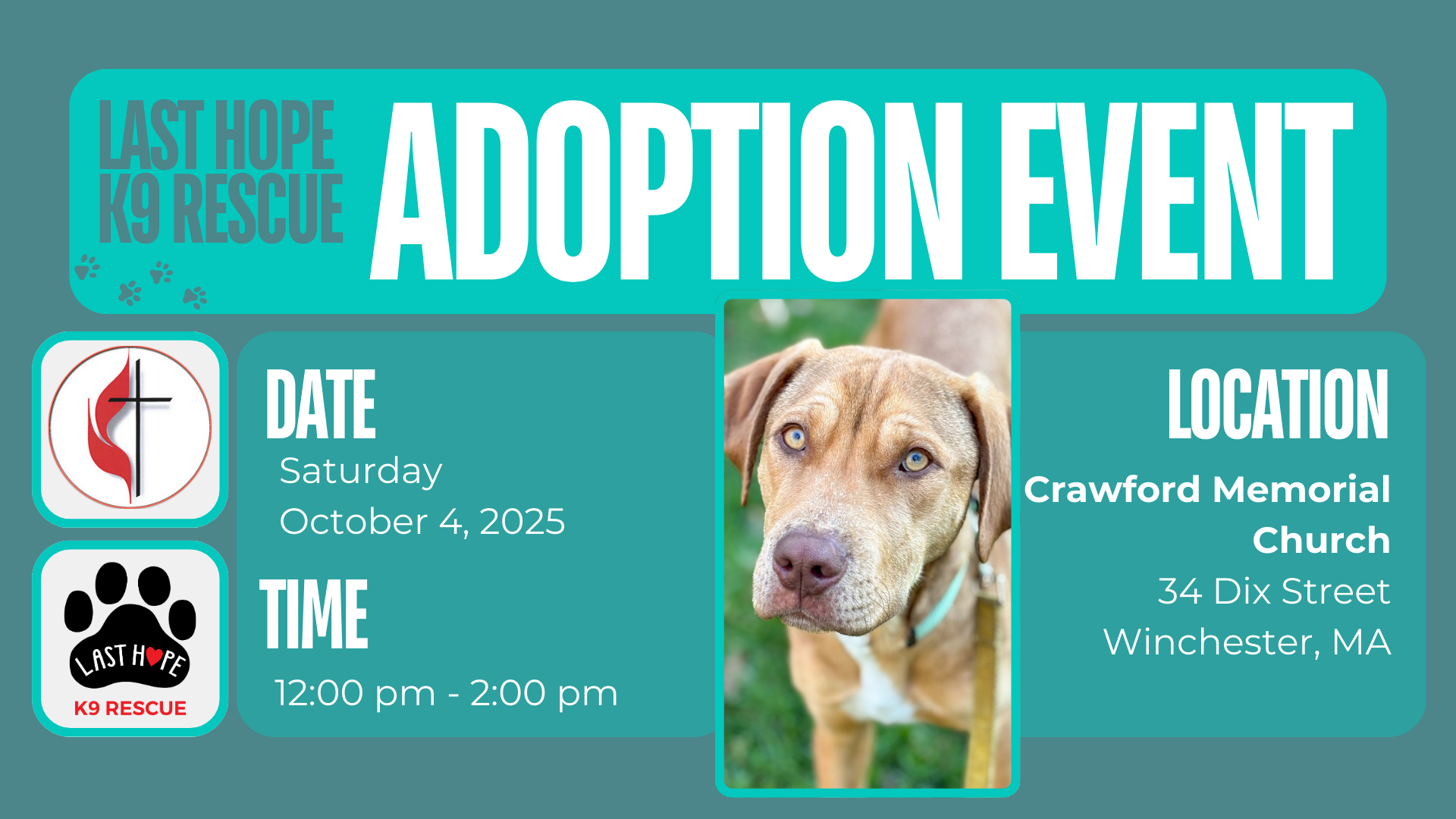 Join us at Crawford Memorial Church in Winchester, MA on Saturday, October 4th for a Last Hope K9 Rescue Adoption Event! All attendees must have applications on file in order to be able to enter the adoption event space. The LHK9 adoption application can be...
